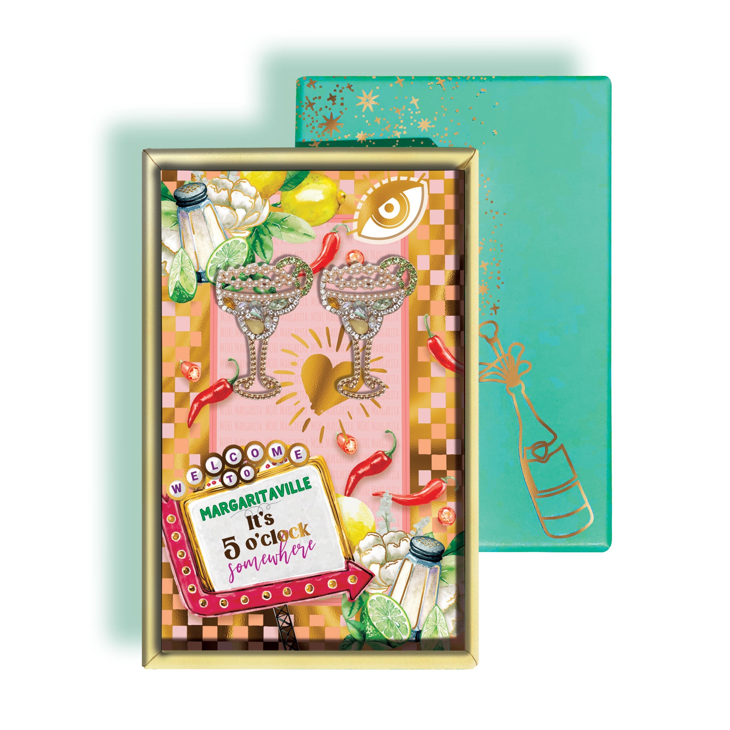 Our 'Party' earrings are the sparkly, fun accessory you can't do without this festive season. Add some pizzazz to any party dress or simply dress up your jeans & t-shirt ensemble! These earrings are our "Margaritaville' gold and diamond rhinestone Margarita glasses.