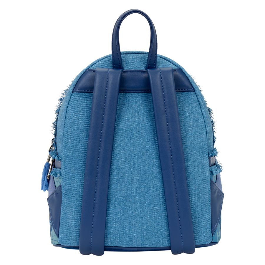 This mini backpack features faux denim, metal charms, and fringe. On the front pocket, you'll find the Hogwarts crest with symbols of each house. The bottom of the front pocket and side pockets feature an all-blue argyle-type pattern, which includes the Hogwarts "H" symbol. Turn it around to find "Harry Potter" debossed on one of the straps.