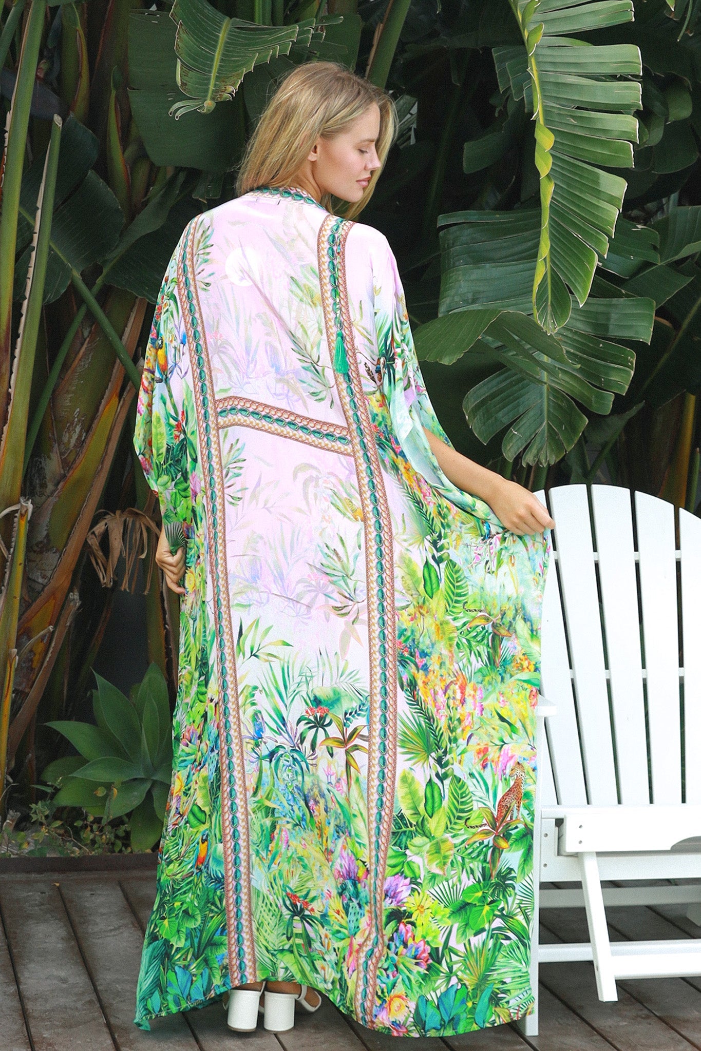 Charlii Kaftan in luxurious viscose crepe with an exclusive print. This lightweight fabric features a subtle crinkled texture and silky sheen, draping beautifully against the body. Highly breathable and absorbent, it's ideal for warm weather. The twisted yarns provide natural wrinkle resistance and a touch of stretch for comfort. Pattern placement varies, ensuring each piece is uniquely yours. Model wears size 8 at 170cm.