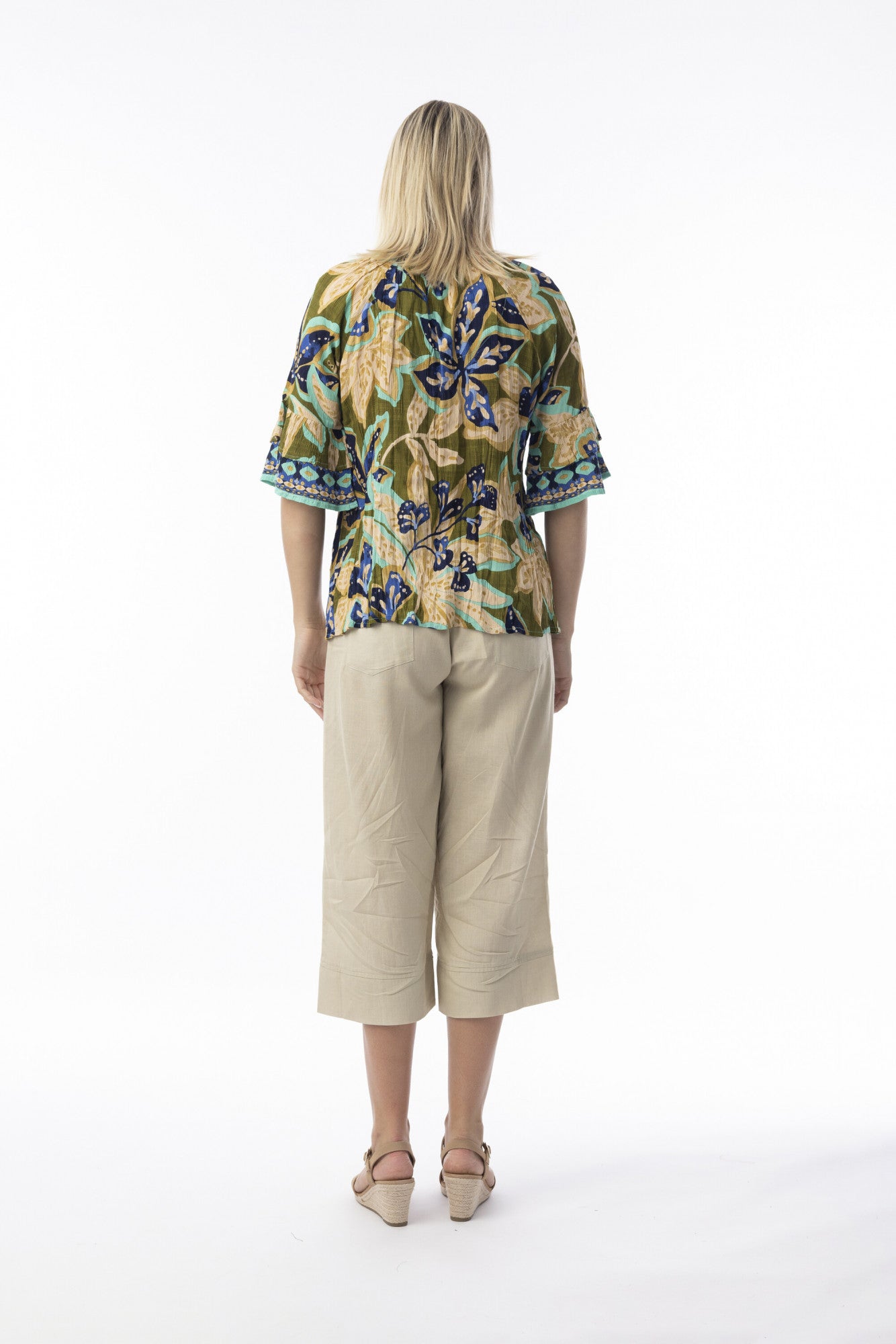 Experience effortless style with our vibrant Playa Brava boho top. Crafted from organic cotton, this top features a relaxed fit, frill sleeves, an open neckline with tassel details, and vibrant prints. Elevate your summer wardrobe with effortless style.