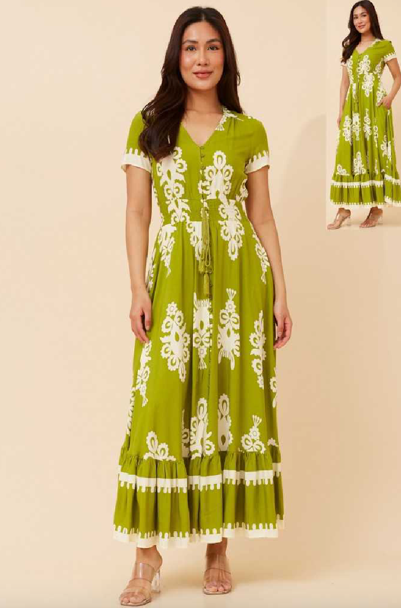 The dress features a stylish border print that adds a touch of elegance! Ideal for a casual day out or a weekend getaway, pair it with sandals for a relaxed yet stylish look.